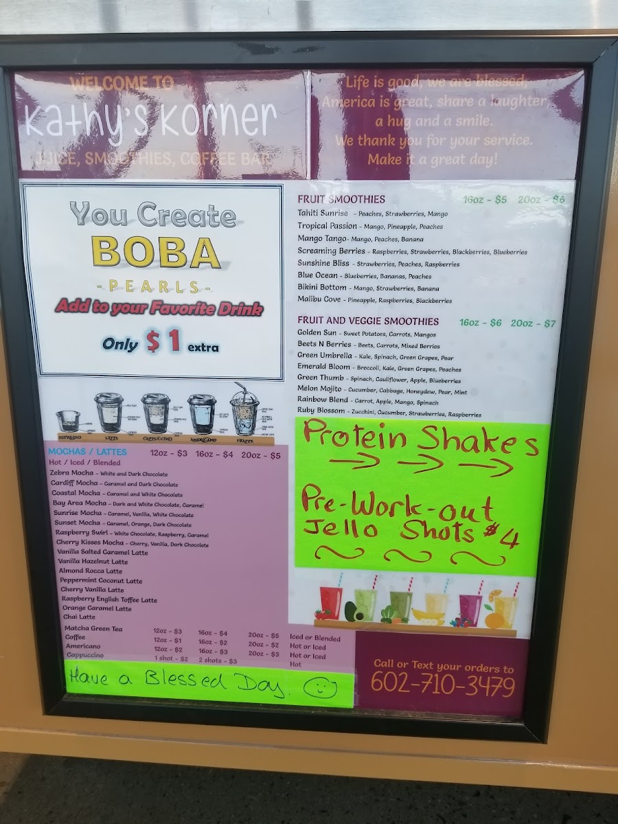 Welcome to Kathy's Korner, a hidden gem nestled within the confines of the Luke Air Force Base in Glendale, AZ. This delightful café is not just a stop for a drink—it's an experience that transcends the typical café visit. Here, health-minded individuals and anyone seeking a refreshing treat will find a vibrant menu bursting with flavor and wellness.